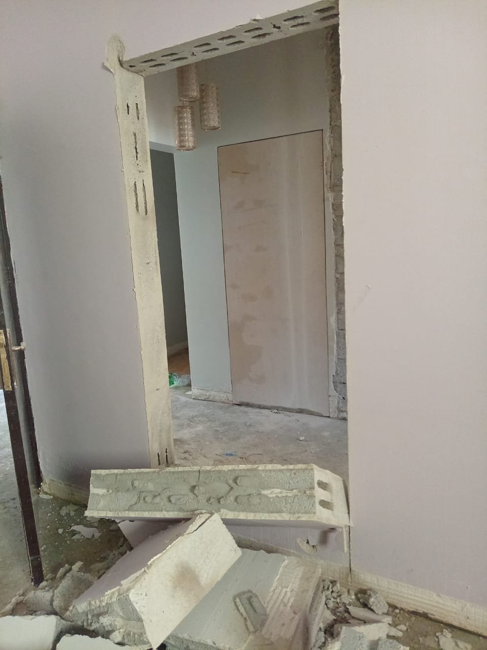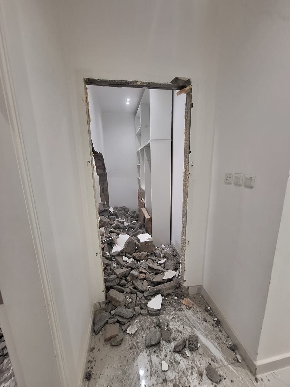 نقوم بالمعاينة أولًا لتحديد إذا كان الجدار حامِل أو لا، وإذا لزم الأمر نضع حلول تدعيم.